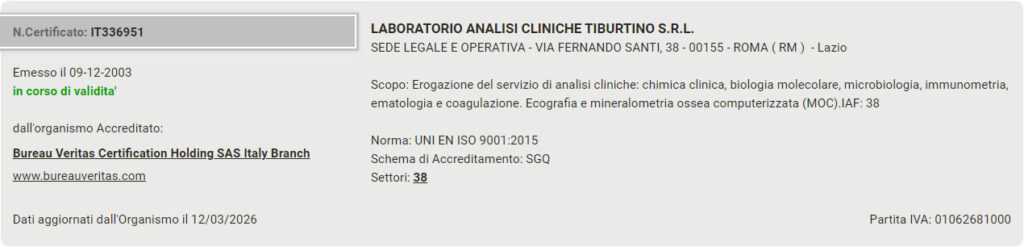 Il Laboratorio Analisi Cliniche Tiburtino e l’RMX Radiologia Medica adottano un servizio di qualità in conformità allo Standard UNI EN ISO 9001:2015 dal 2003.